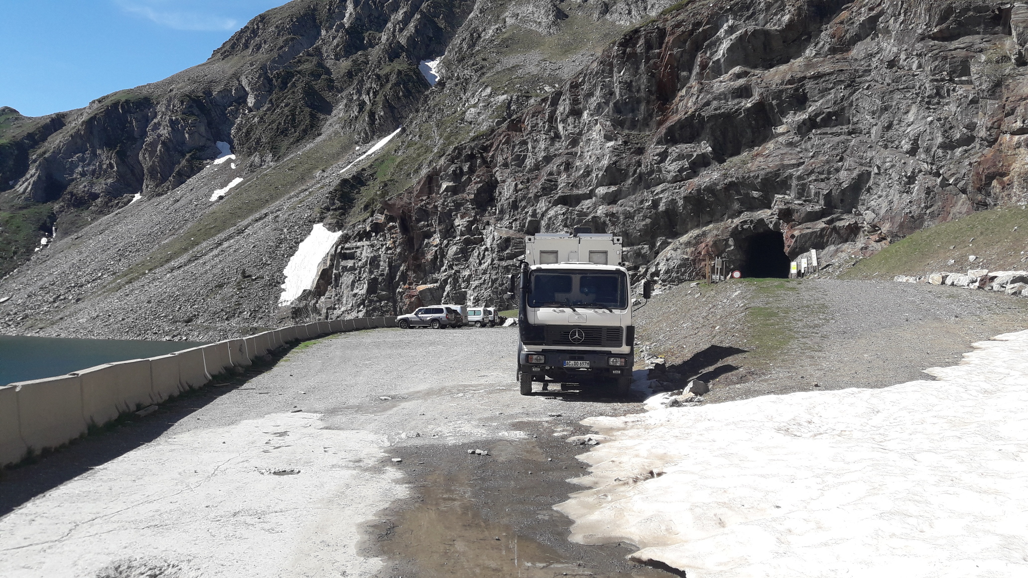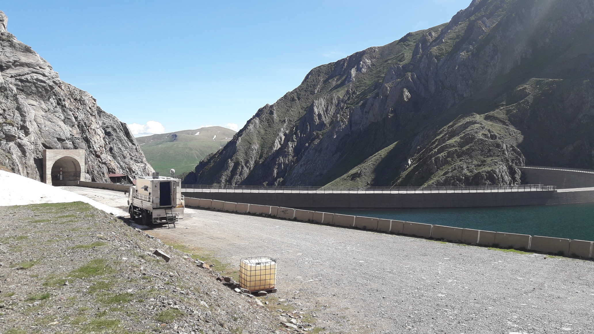 Parking spot next to a reservoir. Base camp for mountaineering and hiking tours in the Pyrenees.