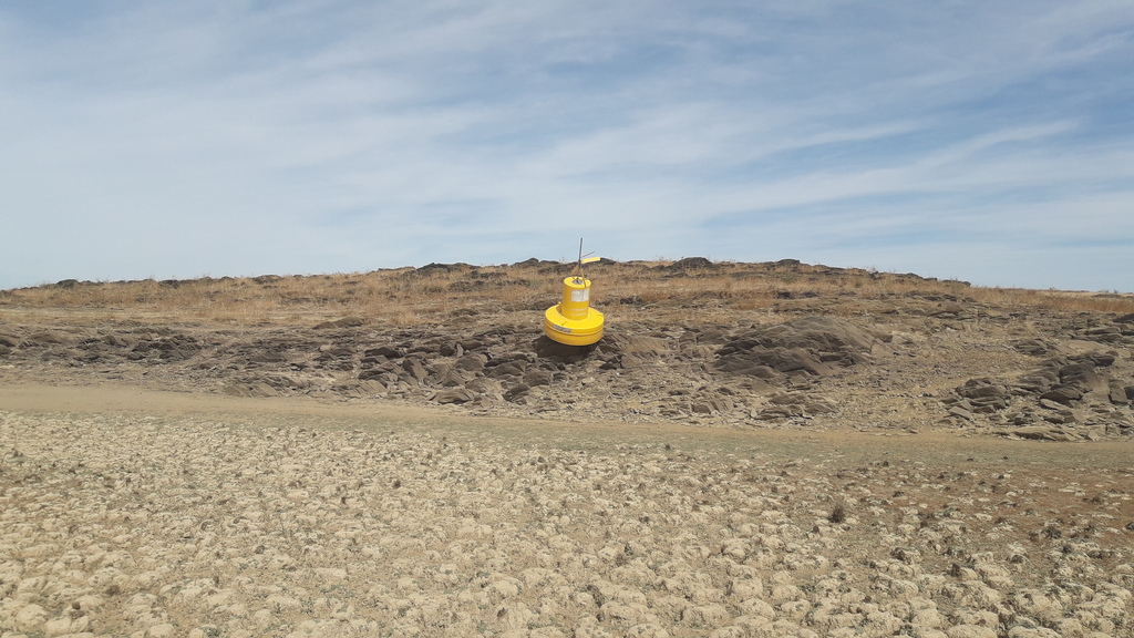 According to satellite images, we are standing with our truck in the middle of a reservoir. But the water in the lake is now, at the end of summer, 10 meters below the highest level. The gras covered shorelines prove that the lake was not filled completely for years.