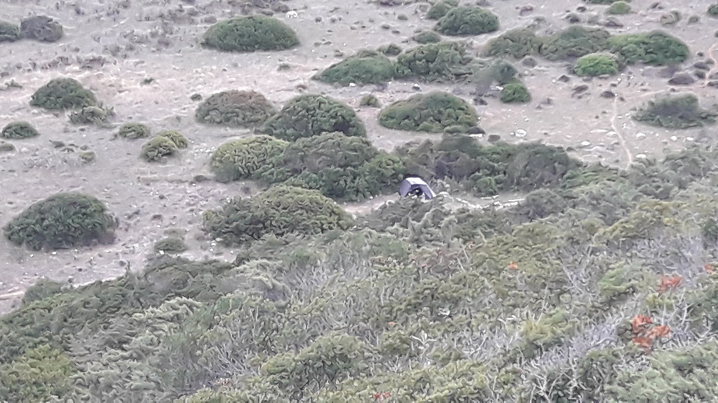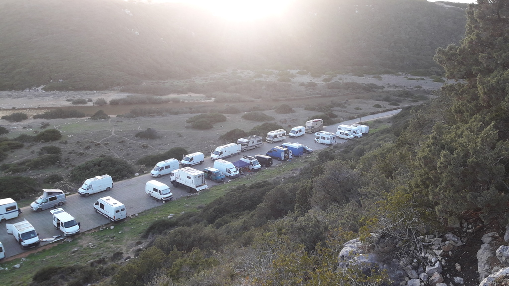 On the last morning, I witnessed a police raid. A patrol car arrived shortly after dawn and blocked the exit. The three police officers knocked on each camper van to wake their residents. Then, too conspicuous camping such as the erection of pavilions, tables and chairs was punished, and the correct parking order was enforced. I watched the scene from a distance during a dog walk from a cliff.